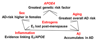 In addition to APOE4 risk, women are at greater risk of AD; the exact cause is unknown, but there are extensive studies on the link between menopause, leading to loss of circulating estrogens, and AD. Breast cancer therapy usually involves chemical or surgical menopause and epidemiology has looked at the risk of dementia in breast cancer survivors. Definitively, women who undergo early oophorectomy have a significantly increased risk of dementia in later life. In our collaborations with the late, great Judy Bolton, we explored estrogen replacement therapy (ERT) and selective estrogen receptor (ER) modulators (SERMs) extensively, both from the perspective of the balance of risk versus benefit associated with ERT and the pursuit on an “ideal SERM” that might provide a safer alternative to ERT. The hope is that a safer alternative to ERT would be used by perimenopausal women to dampen the effects of the precipitous drop in estrogen production with menopause. Currently a brain-bioavailable selective human ER partial agonist (ShERPA) is being studied in familial AD transgenic (FAD-Tg) mice that express human apoE isoforms in collaboration with Mary Jo LaDu at UIC. This ShERPA, TTC-352, has already proven safe in Phase 1 clinical trials for metastatic breast cancer.